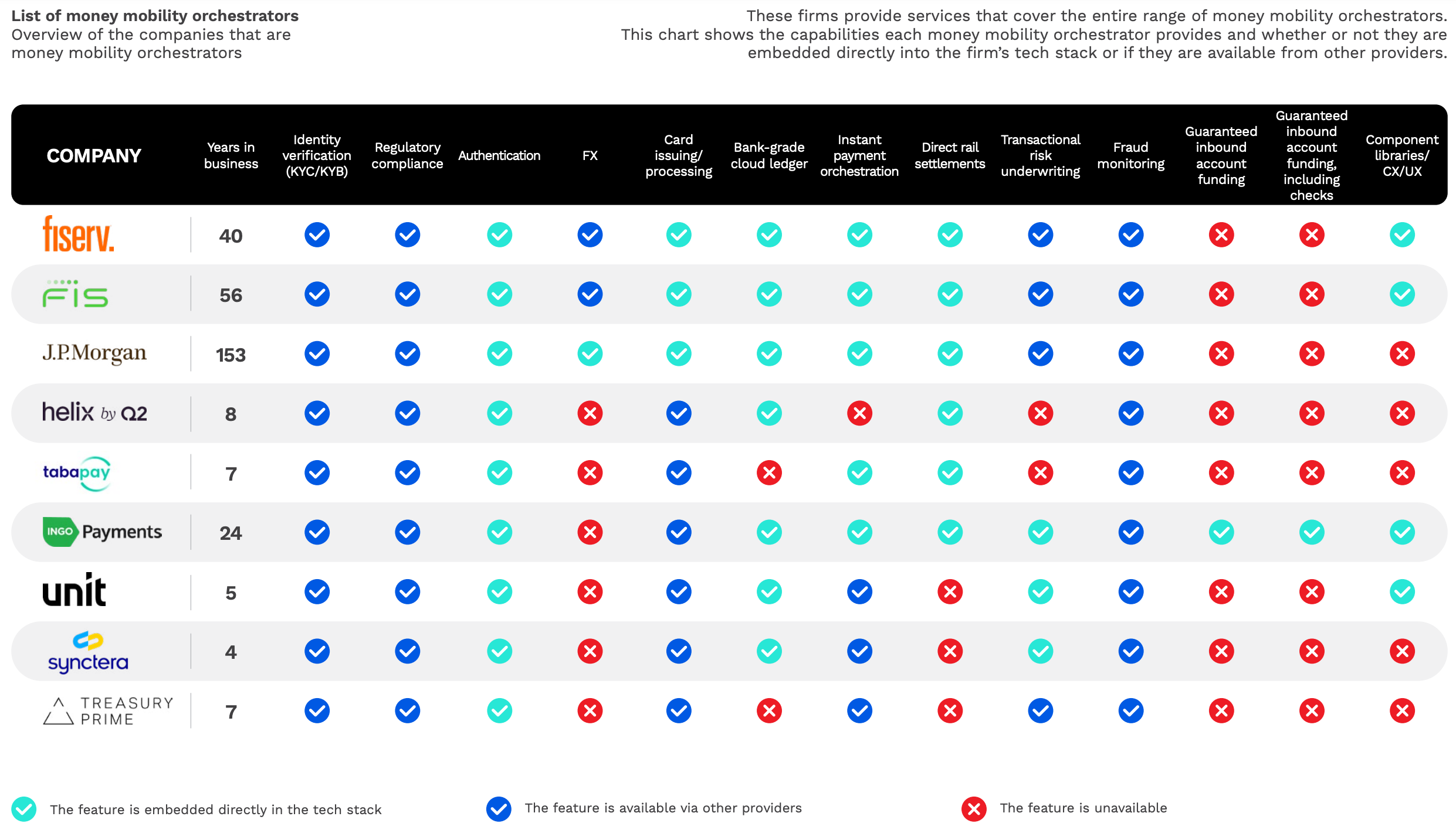 The following table provides a comprehensive overview of the various players in the financial technology and services ecosystem, categorized by their primary functions while acknowledging their presence in multiple areas of this ecosystem.