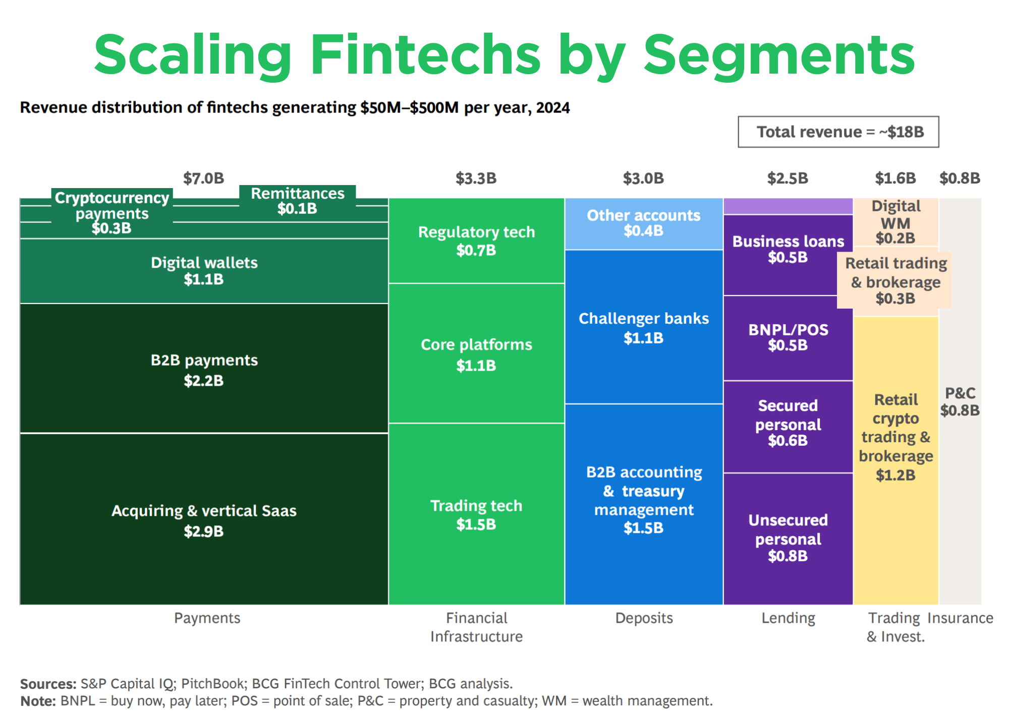 B2B(2X) fintechs—those serving businesses or enabling others to serve them—represent the largest share of revenues among scaling fintechs. While consumers have seen much of the fintech innovation to date, businesses still face outdated, manual, and fragmented workflows, especially in payments, treasury, and accounting.