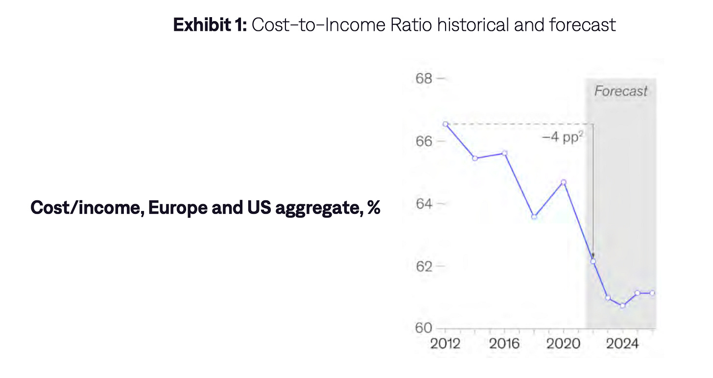 Today’s mid-market bank must navigate a complex and challenging landscape: cloudy macroeconomic and geopolitical conditions, interest rate uncertainty, increased competition from both market heavyweights and disruptive fintech upstarts, and rapidly evolving customer expectations. These factors exert considerable pressure on banks’ financial performance. The outlook from 2024+ suggests that cost-to-income ratios for the sector are expected to remain flat in the low 60% range, ending a decade-long period of sustained improvement that saw this figure decline globally by roughly 4 percentage points on average.