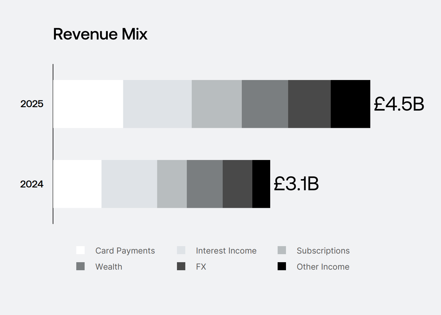 The 2025 revenue breakdown reveals that card payments remain the largest single revenue stream at 22.2%, closely followed by interest income at 21.6%. The growth in subscription revenue, which reached 15.7% of the total, is particularly significant as it represents a recurring, high-margin income source that reflects deepening customer engagement. Wealth services, including equities and cryptocurrency trading, contributed 14.7%, while foreign exchange services accounted for 13.4%. Internally, the company now tracks 11 distinct product lines that exceeded £100 million in revenue during the 2025 fiscal year, illustrating the breadth of its monetization engine.