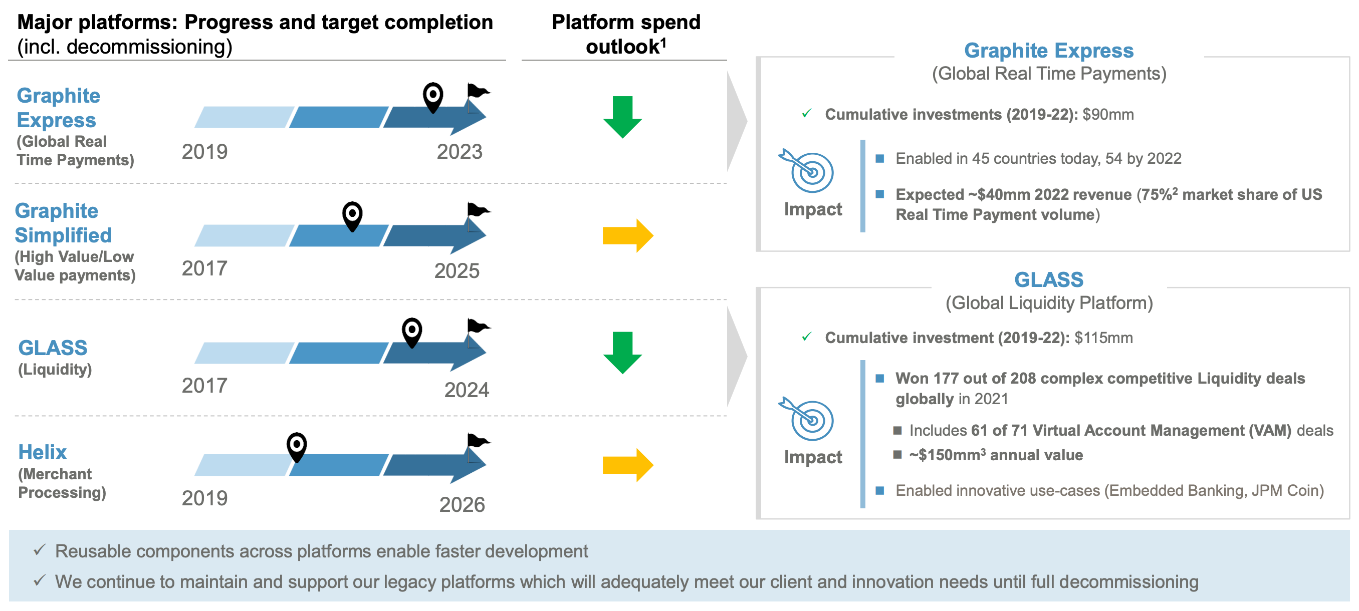 Embedded Finance & Solutions: Banking-as-a-service and API-driven offerings that let fintechs and corporates embed JPMorgan’s payments, accounts, and compliance services directly into their own products. JPMorgan touts having the “best overall embedded finance platform” and is the largest bank with in-house pay-in, liquidity, and pay-out capabilities. Notably, they built a single consolidated data lake to unify data across products and created an intelligent Trust & Safety (fraud prevention) platform for clients.