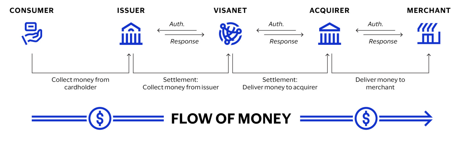 In a typical Visa C2B payment transaction, the consumer purchases goods or services from a merchant using a Visa card or payment product. The merchant presents the transaction data to an acquirer, usually a bank or third-party processing firm that supports acceptance of Visa cards or payment products, for verification and processing. Through VisaNet, the acquirer presents the transaction data to Visa, which in turn sends the transaction data to the issuer to check the account holder’s account balance or credit line for authorization. After the transaction is authorized, the issuer posts the transaction to the consumer’s account and effectively pays the acquirer an amount equal to the value of the transaction, minus the interchange reimbursement fee. The acquirer pays the amount of the purchase, minus the merchant discount rate (MDR), to the merchant.
