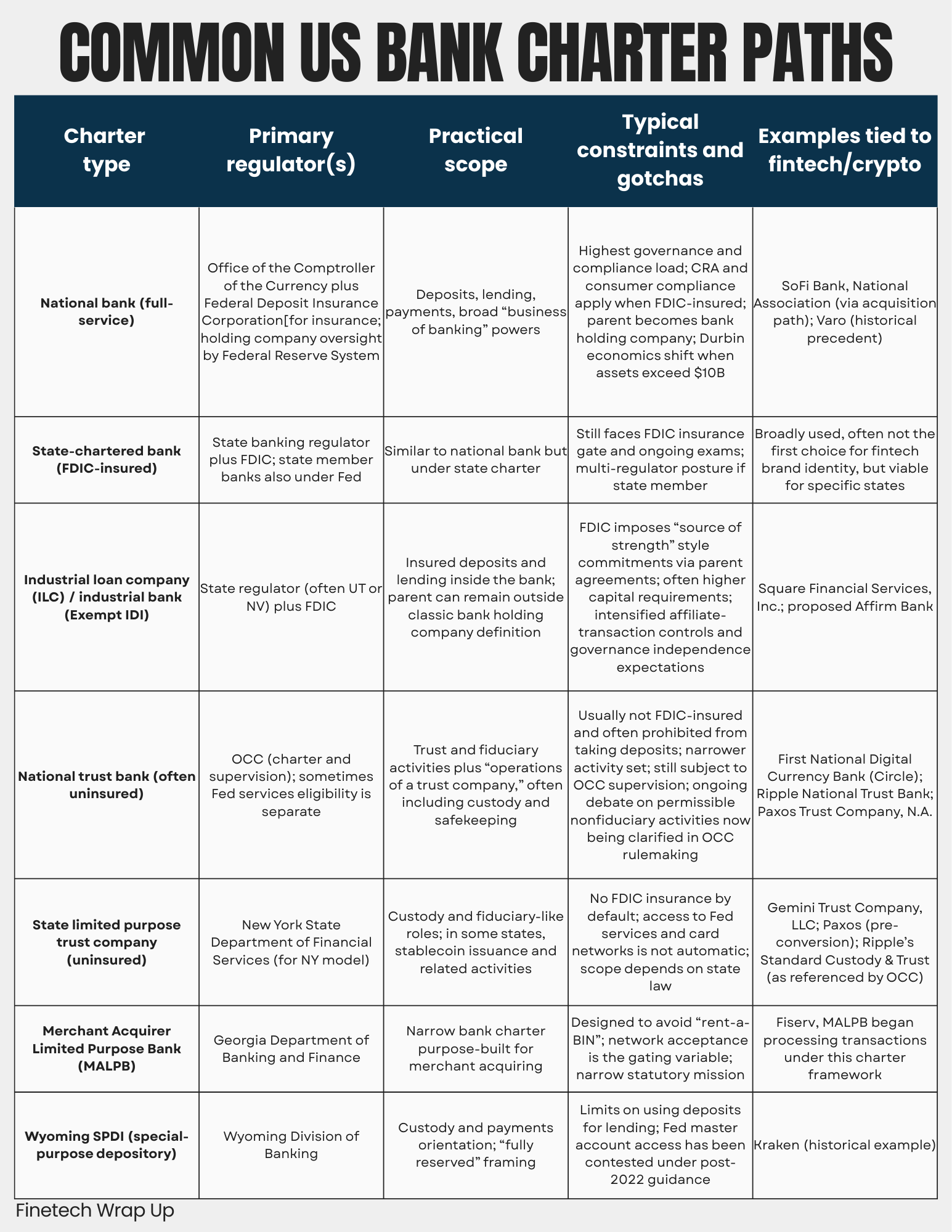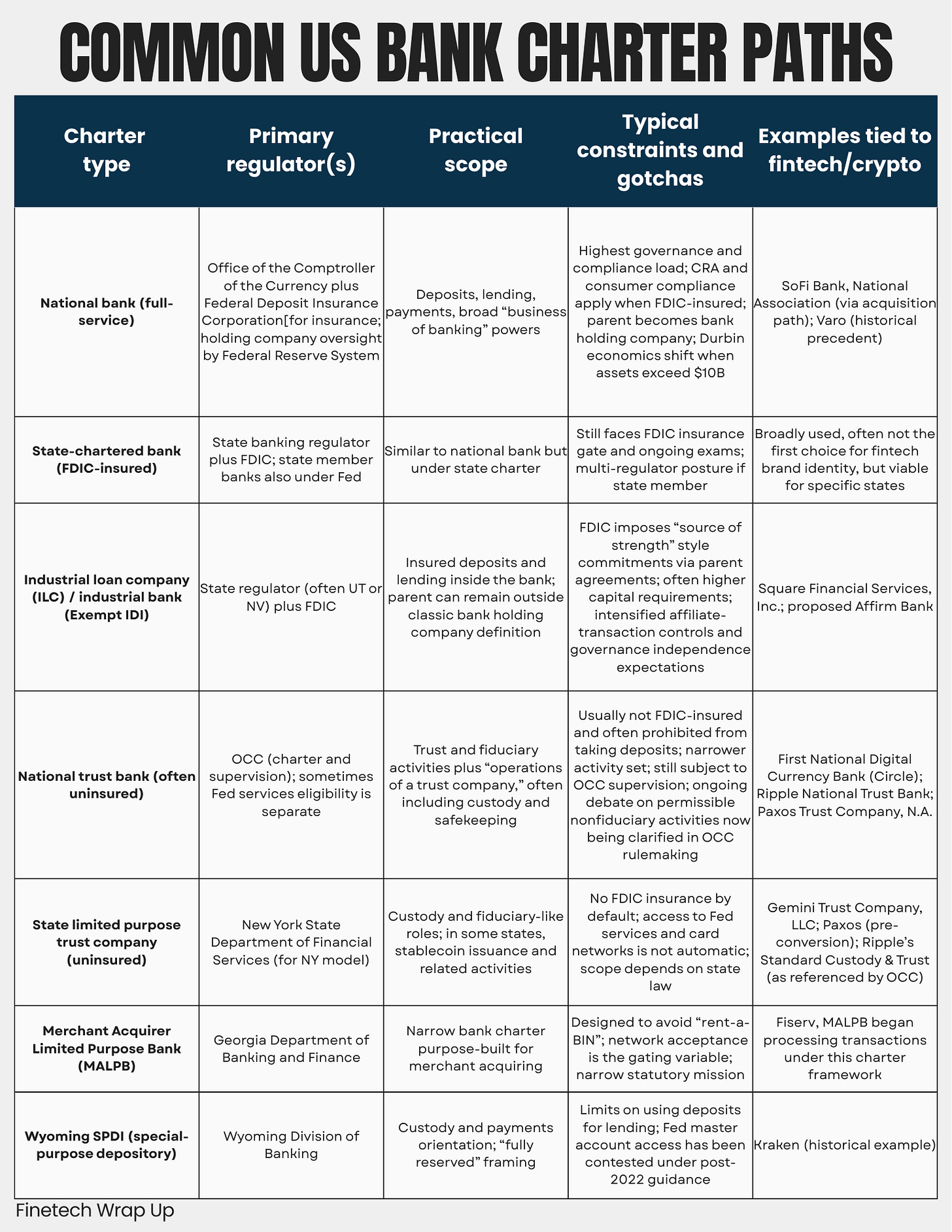 When I map charter interest across fintech and crypto, I see firms selecting from a menu of “legal capabilities,” not picking a monolithic status badge. The recent wave is heavy on limited-purpose designs (trust banks, merchant-acquirer charters, ILCs) because they target a single bottleneck: funding, network access, or custody.