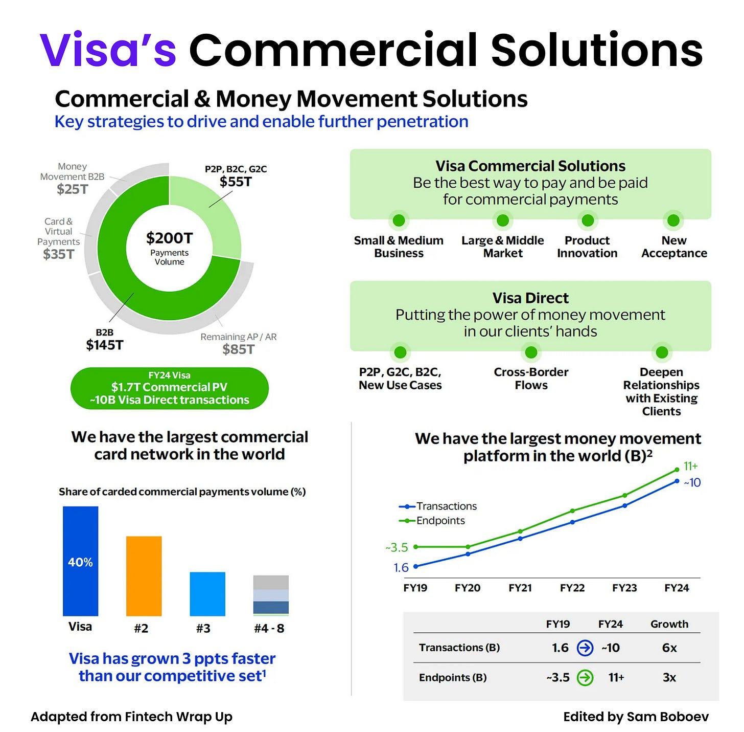 The addressable market here is massive. Visa estimates roughly $200 trillion in annual volume across these non-consumer flows, split between $55 trillion in money movement and $145 trillion in B2B payments.