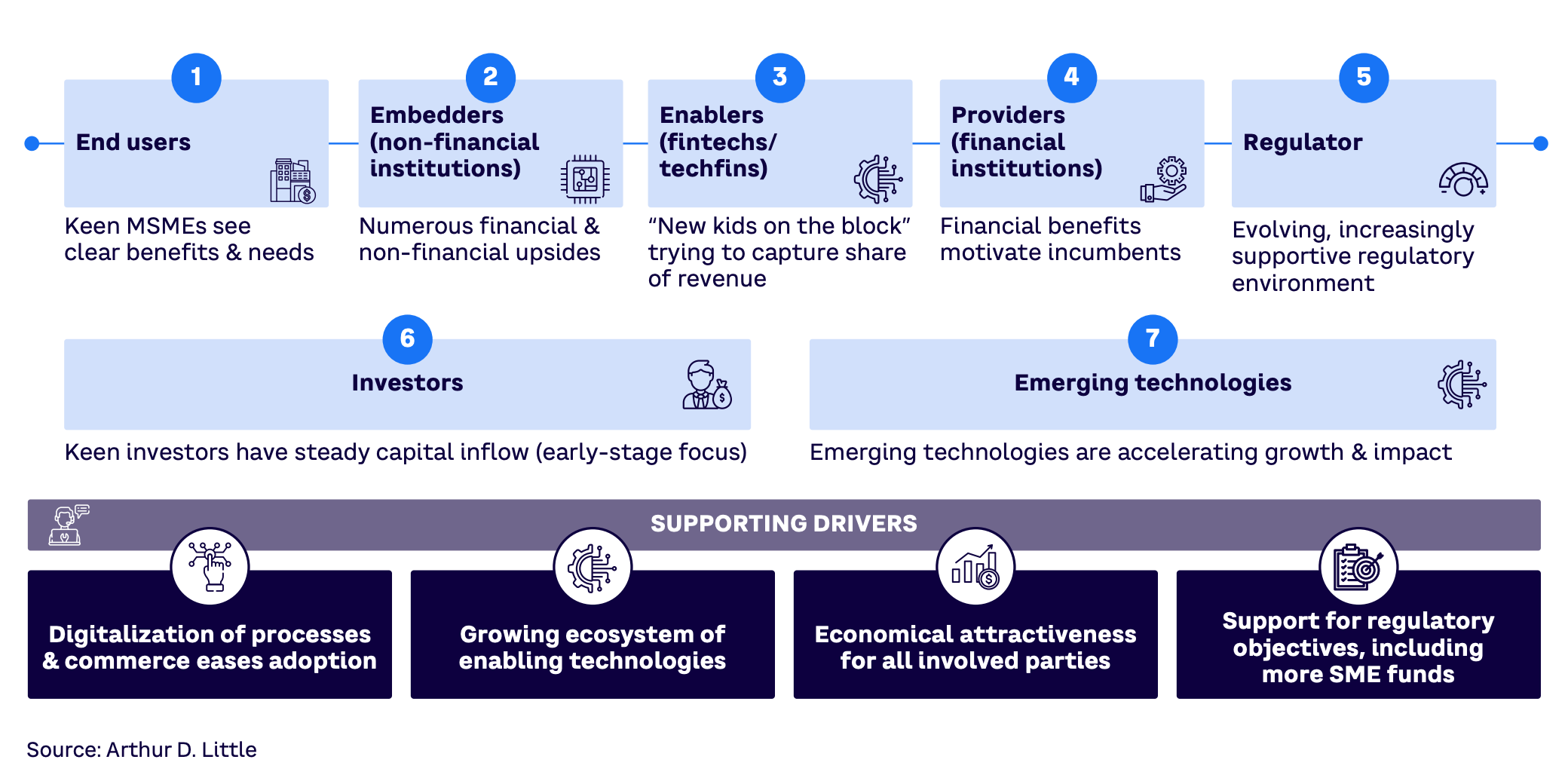 In principle, B2B BNPL works in the same manner as B2C BNPL, but the end customer is a company instead of an individual. It is offered by individual suppliers or through marketplaces. Individual suppliers are companies that supply other businesses with their products, such as machinery, office furniture, and so forth. These companies can be found across many industries and in different sizes, from micro-, small-, and medium-sized enterprises (MSMEs) to large corporates. They typically require multichannel BNPL solutions to cover in-person and online sales.