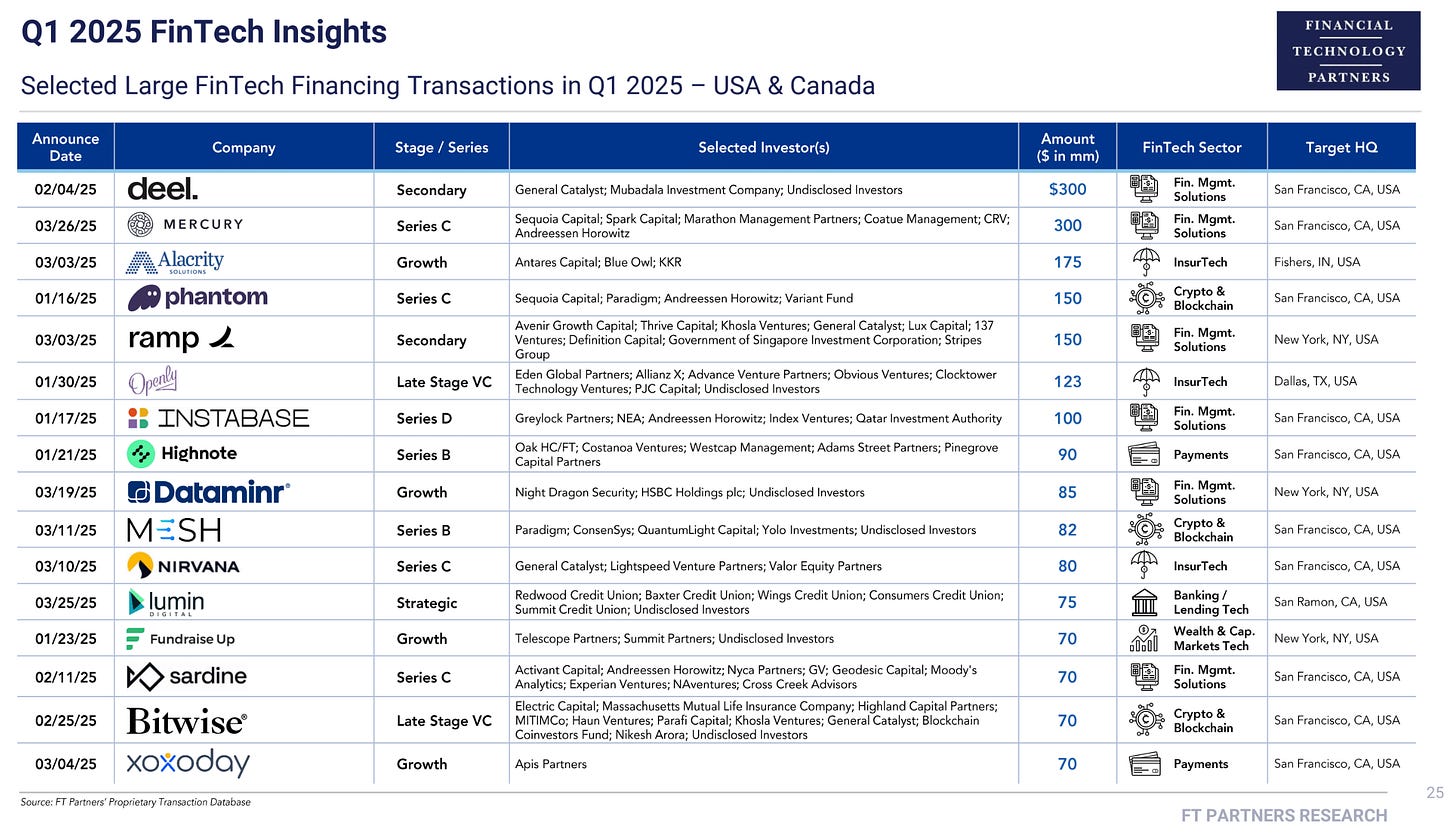 Private FinTech financing totaled nearly $14B in Q1, up 50% YoY from Q1 2024’s low of just over $9B. The quarter was boosted by Binance’s record-setting $2B crypto-based investment from MGX—the largest in crypto history. Even excluding Binance, capital raising still rose 28% YoY.