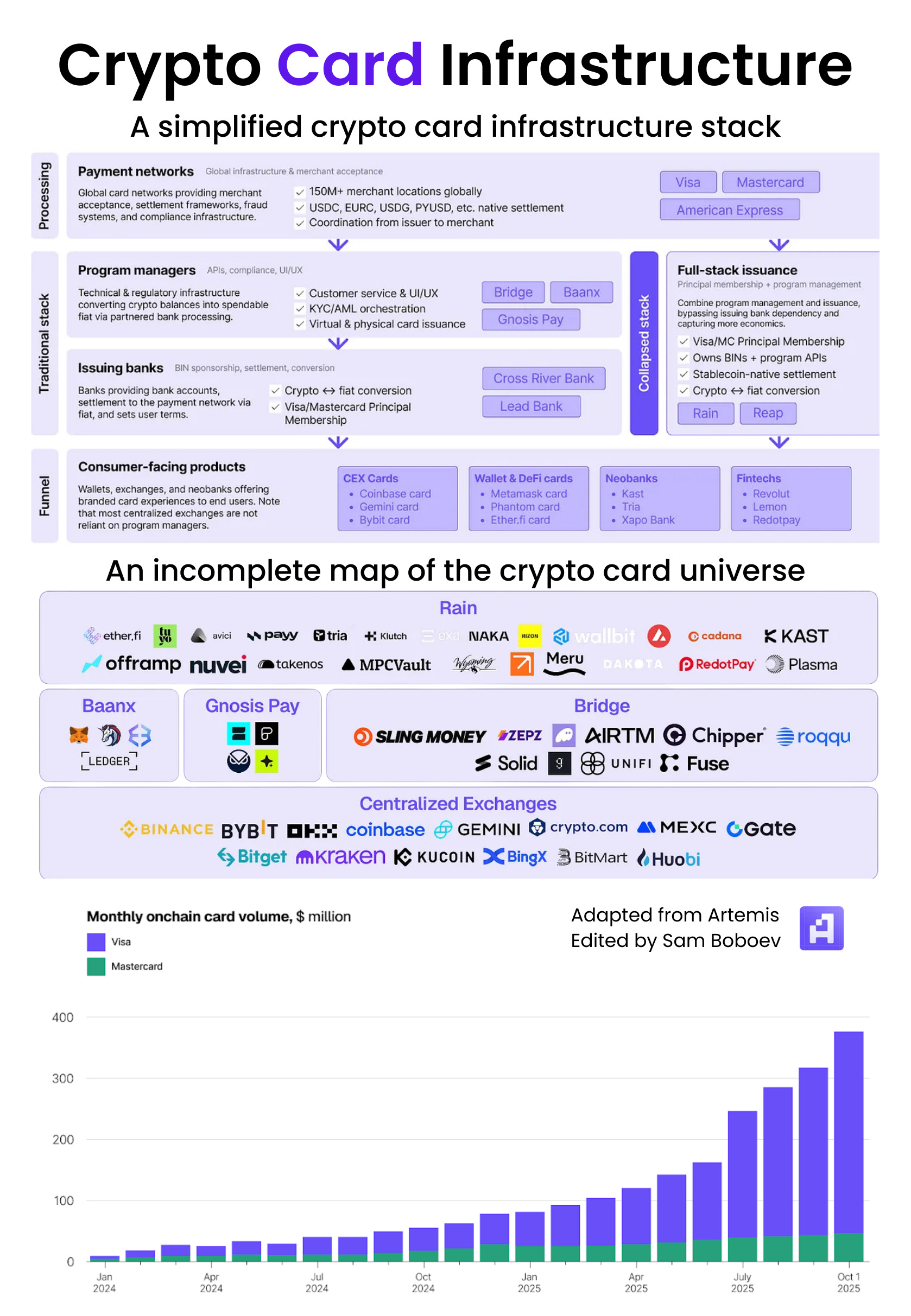 Despite similar program counts, Visa captures a larger share of onchain-linked card volume. This is a distribution outcome, not a product difference.